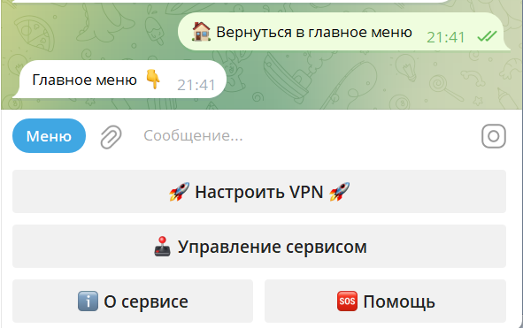 1. Перейдите в наш бот. Главное меню -> Управление сервисом.