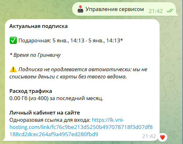 2. Там у вас откроется информация о вашей подписке. Самым последним пунктом будет одноразовая ссылка для входа в личный кабинет на сайте. Перейдите по ней.