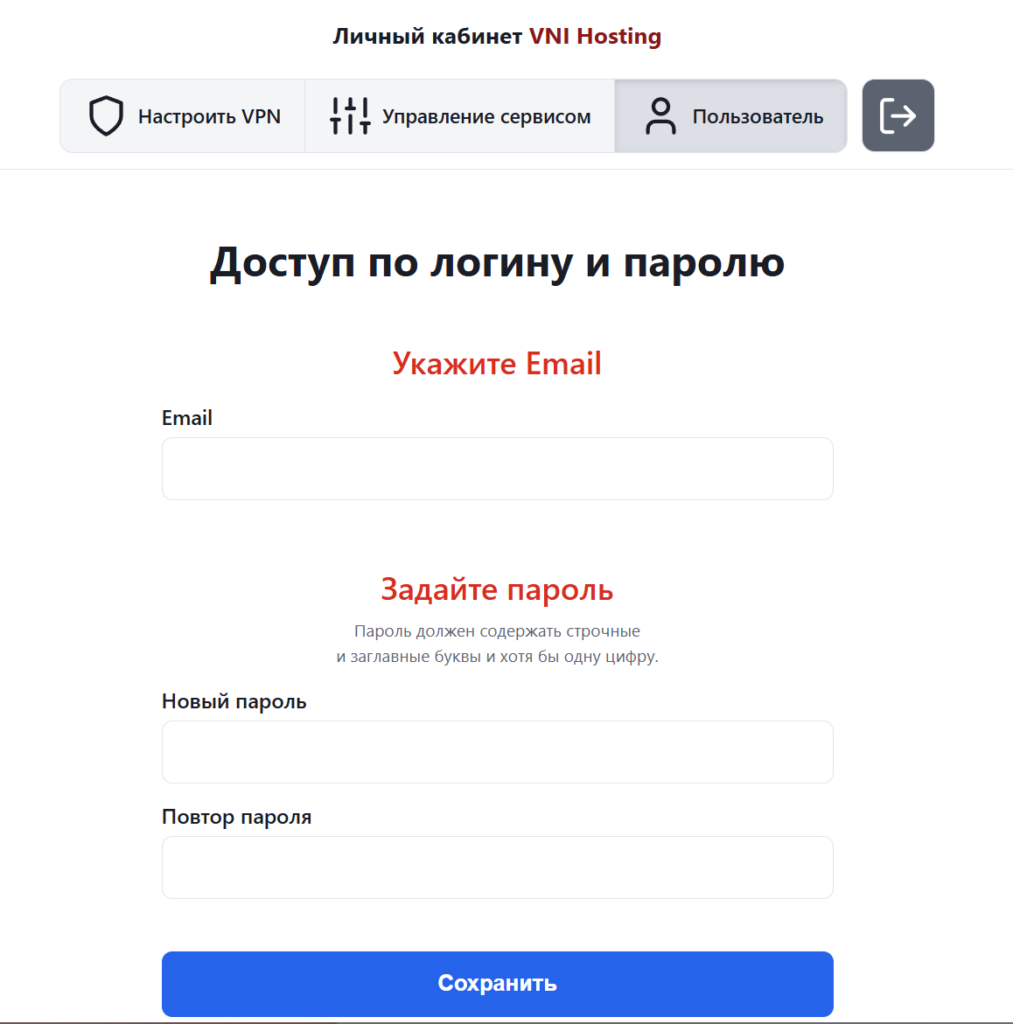 3. Перейдите на страницу «Пользователь» и введите свою почту. Придумайте пароль.