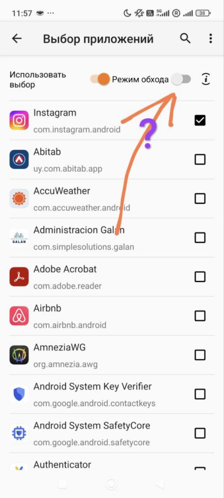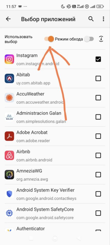 - Если включить тумблер “Режим обхода”, то список начинает работать наоборот. Через VPN будут работать ВСЕ приложения, КРОМЕ отмеченных в вашем списке.