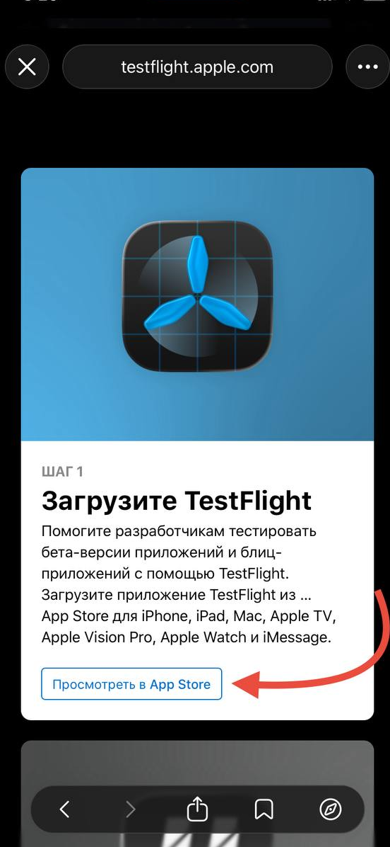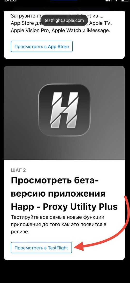Нажмите «Посмотреть в TestFlight» у шага 2. Так вы откроете именно приложение Happ в TestFlight.