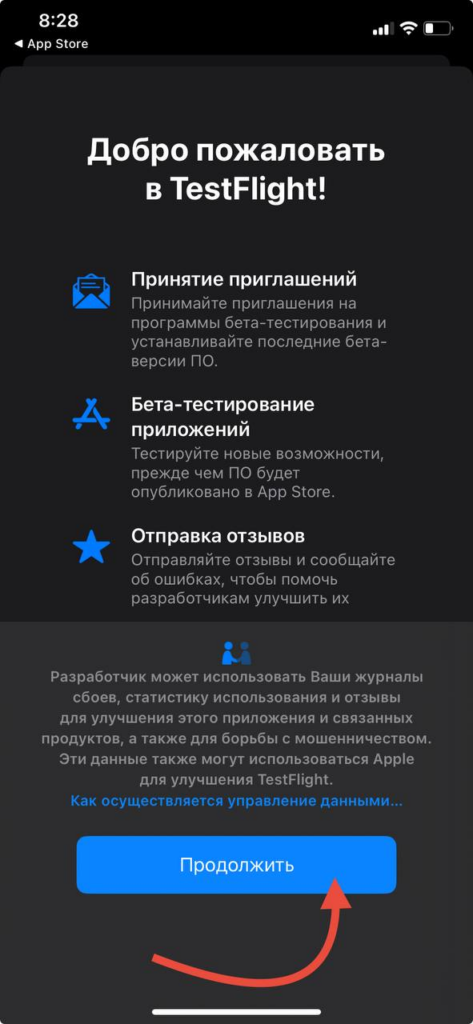 5. После загрузки откройте приложение. TestFlight вас поприветствует и предупредит о сборе данных для Apple. Нажмите «Продолжить».
