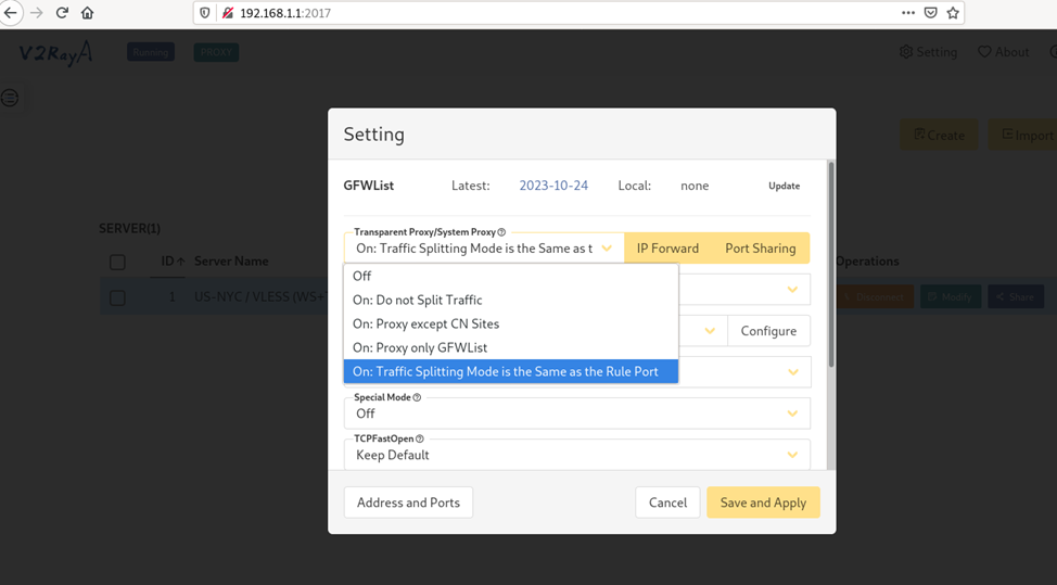 - Transparent Proxy / System Proxy: On : Traffic Splitting Mode is the same as the Rule Port