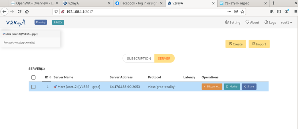 4. Далее -> импортировать (Import) ваш конфиг для подключения к прокси в виде ссылки, либо нажать Create и ввести нужные данные вручную.